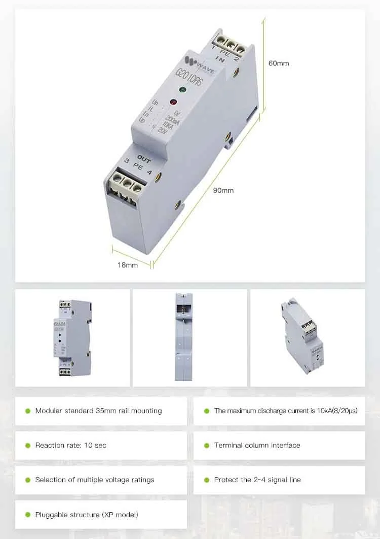 G2010R24/48/110/220 series Industrial control signal line SPD is designed for universal 1 or 2-pairs data lines against the damaging from surges and spikes caused by lightning and other electrical sources, suitable for use in category location B, C or directly at the upstream near the protected devices.